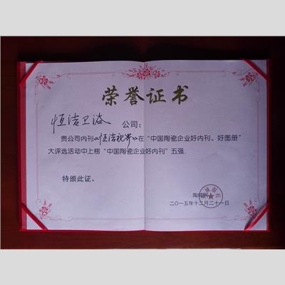 獎(jiǎng) 項(xiàng):《恒潔視界》“中國(guó)陶瓷企業(yè)好內(nèi)刊”五強(qiáng)