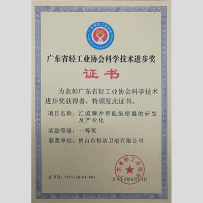 獎 項:廣東省輕工業協會科學技術進步獎 一等獎(項目名稱:匯流瞬沖智能坐便器的研發及產業化)