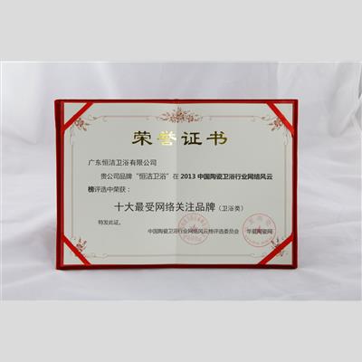 獎(jiǎng) 項(xiàng):2013年中國陶瓷衛(wèi)浴行業(yè)網(wǎng)絡(luò)風(fēng)云榜 “十大最受網(wǎng)絡(luò)關(guān)注品牌(衛(wèi)浴類)”