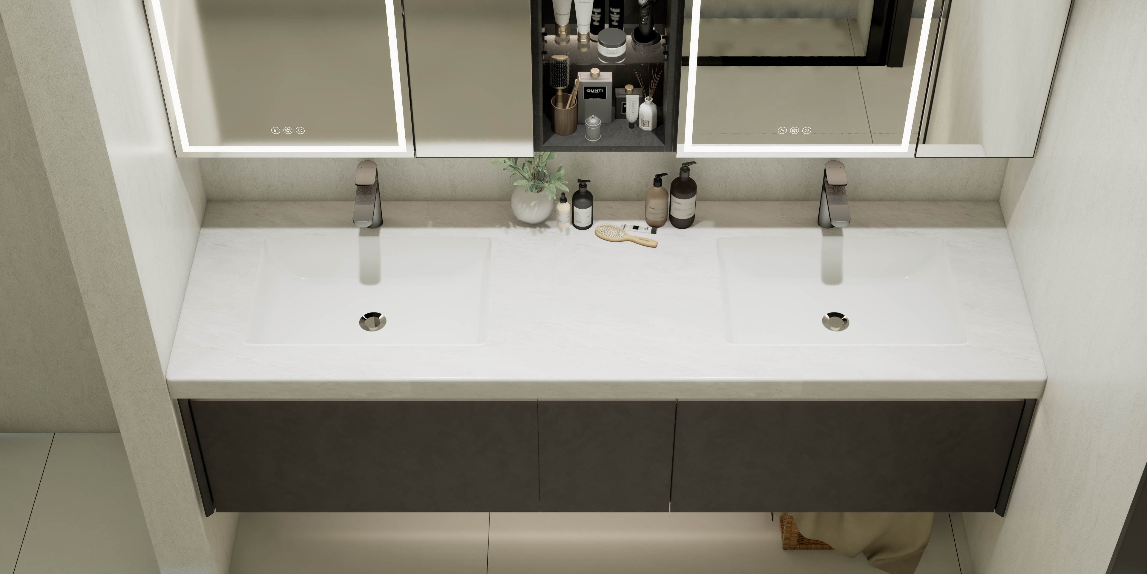 整體風格簡約現代,滿足多口之家使用需求。增加收納空間及合理分區,綜合考量每位家庭成員需求,定制安全、舒適、溫暖的衛浴環境,提升全家人的生活幸福感。