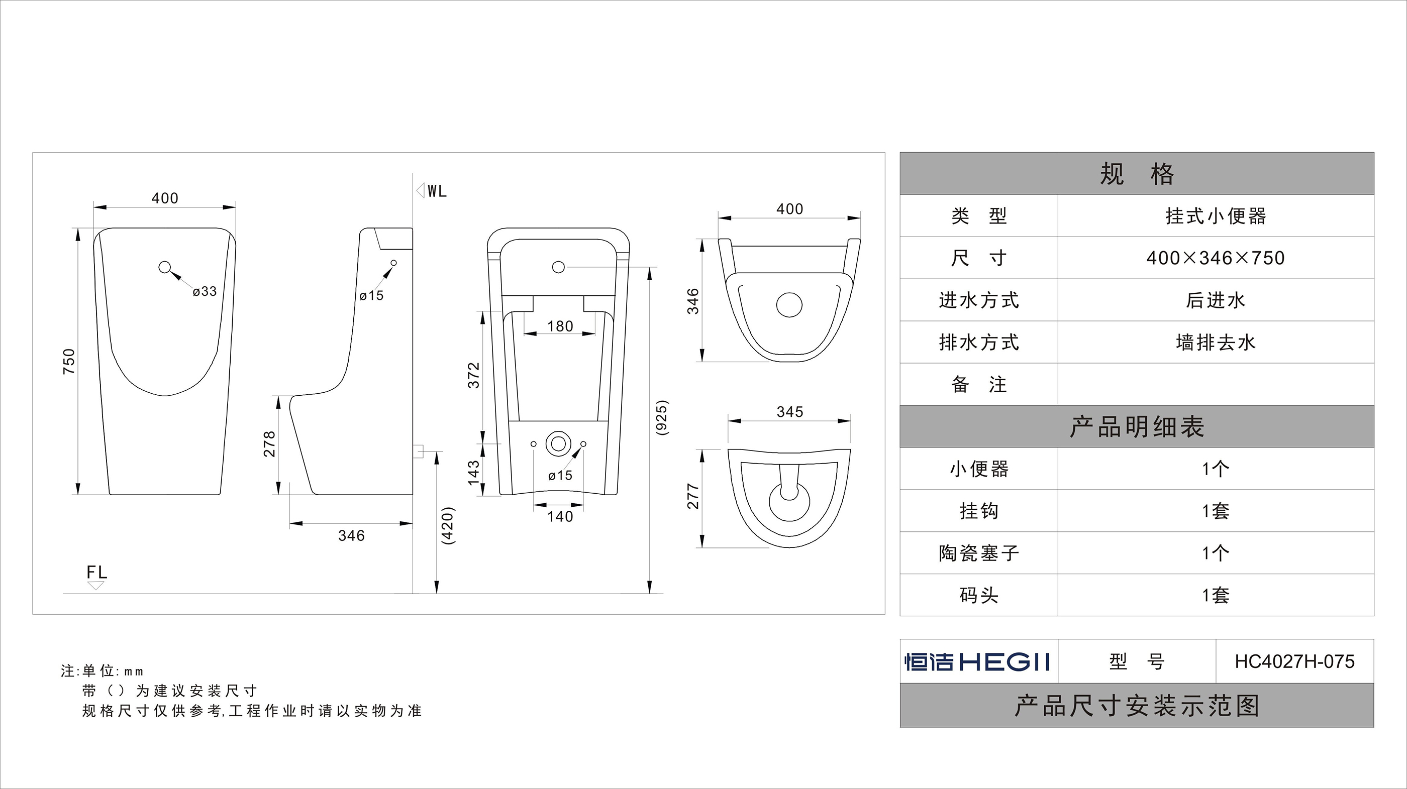 HC4027H-075一體感應式掛式小便斗